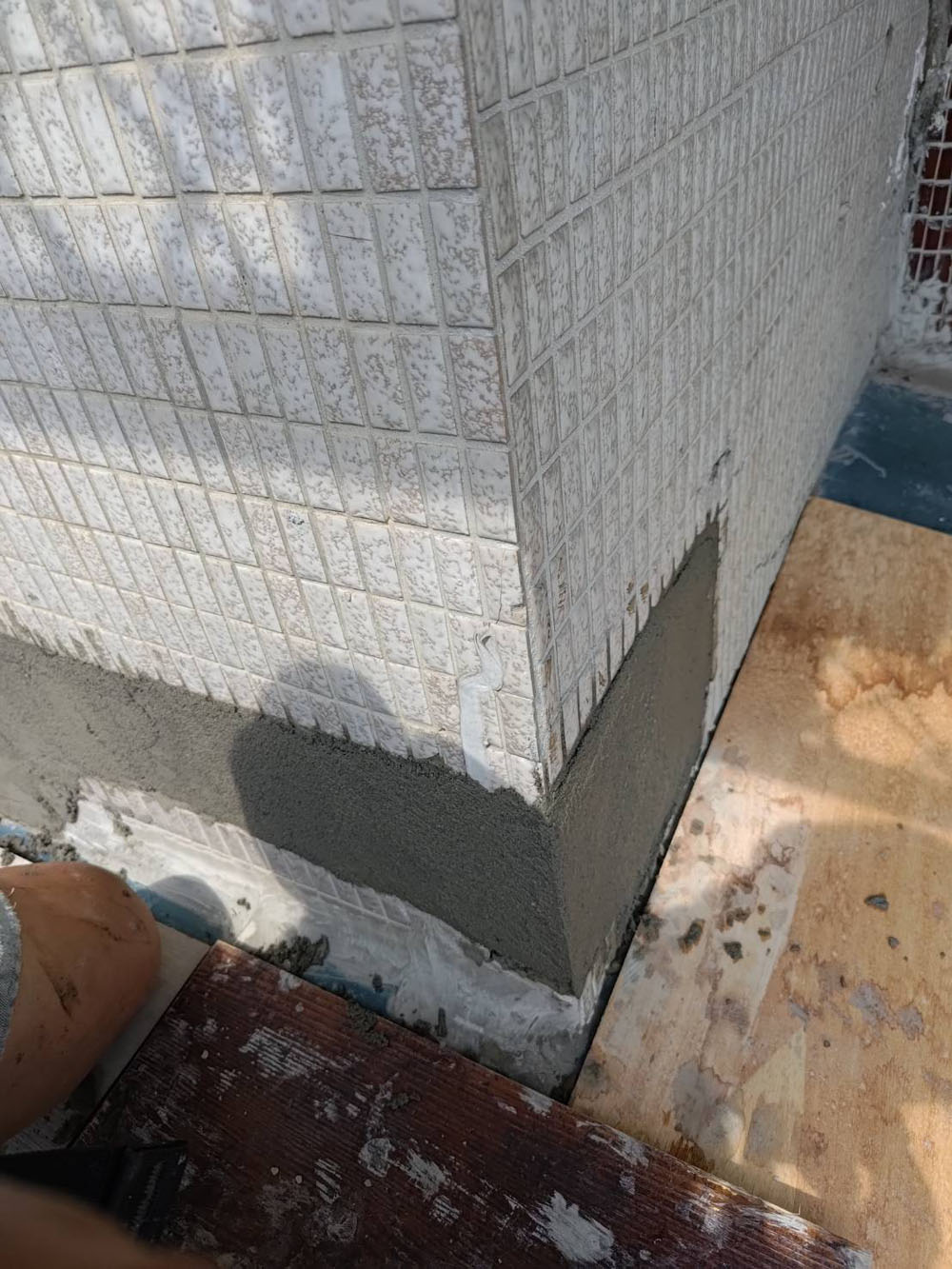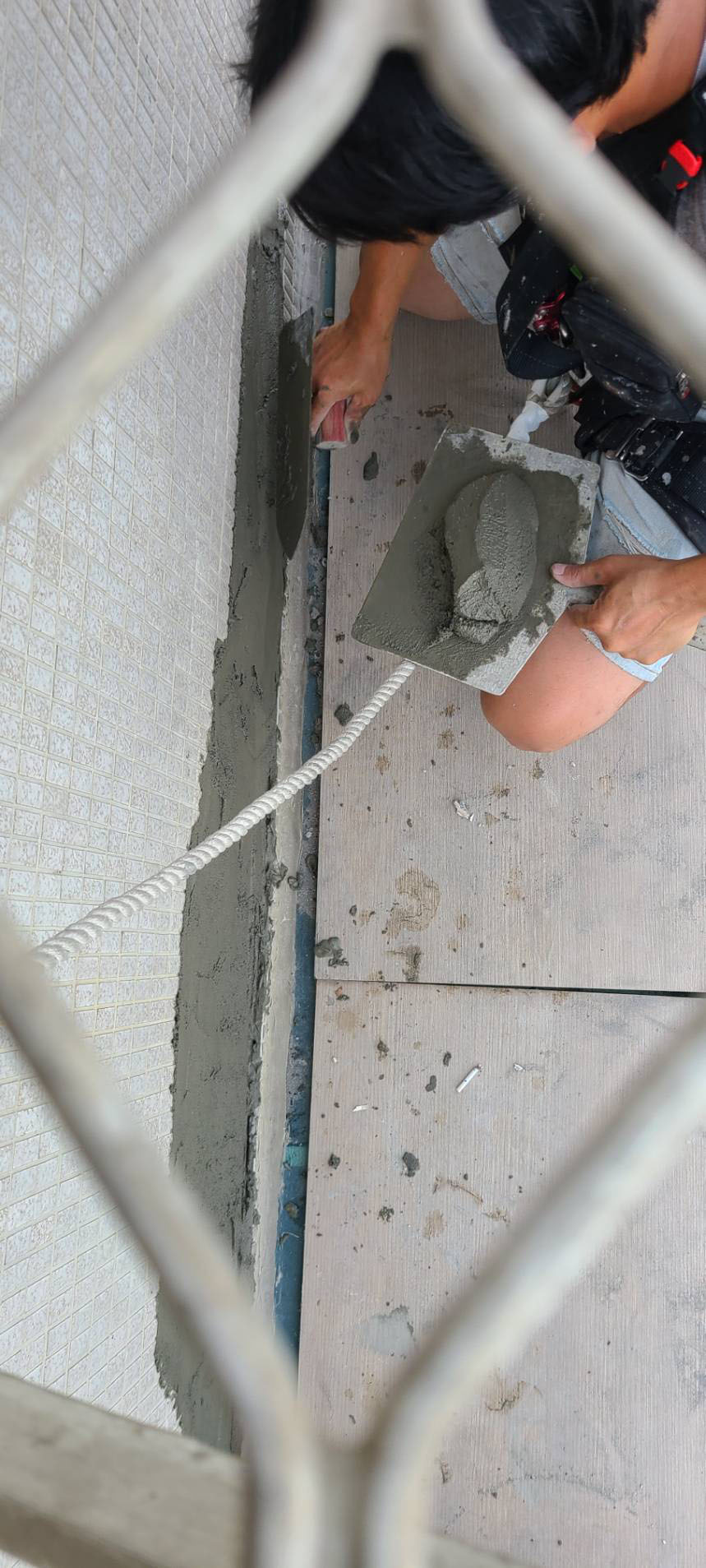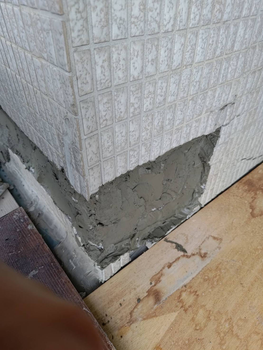 外牆磁磚因水氣滲入而產生澎共,容易造成安全隱患。本案施工團隊先移除鬆動磁磚,再進行牆體清理與防水層重建,最後重新黏貼磁磚或補強表面。此流程能有效改善牆體滲水,避免磁磚持續剝落,同時恢復外牆美觀與安全性,並加強建築物的整體防水性能。
